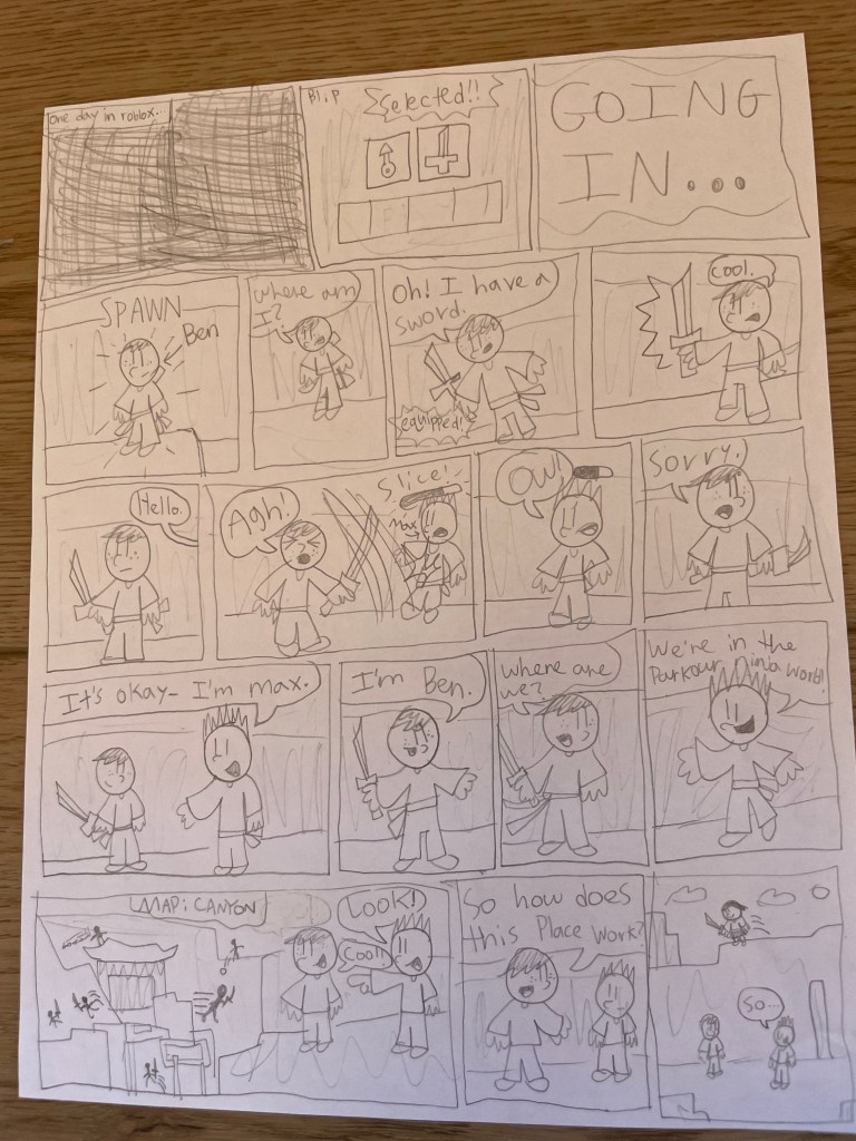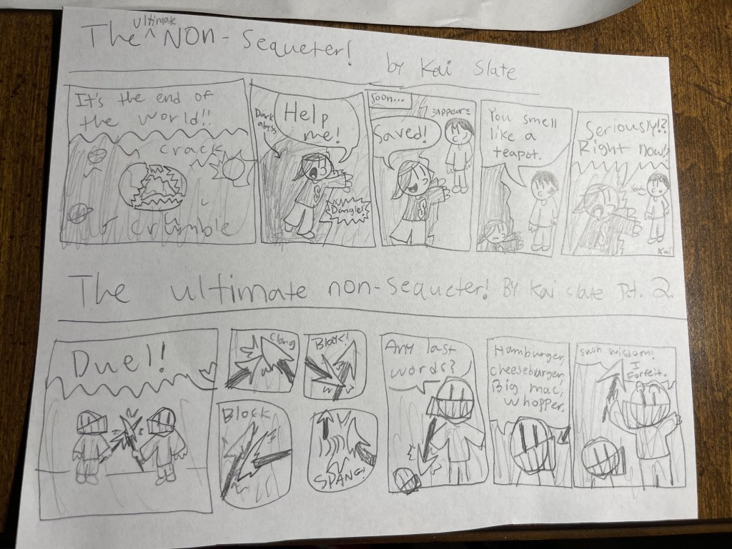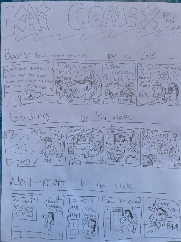 Hi! I’m Kai! I’m 10 years old and I love being creative and drawing comics. If you like these, then that’s great! You can click the “like” button at the bottom. Every week or so I will be putting some new comics on here! If you like one series a lot, then you can send an email to slate@cmu.edu and I will work on that series more. Check back soon!
